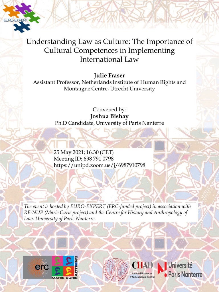 A virtual Talk / Discourse Law as Culture. The Importance of Cultural Competences in Implementinting International Law by Julie Fraser, with Joshua Bishay, will take place on 25 May 2021, 16.30 (CET).
